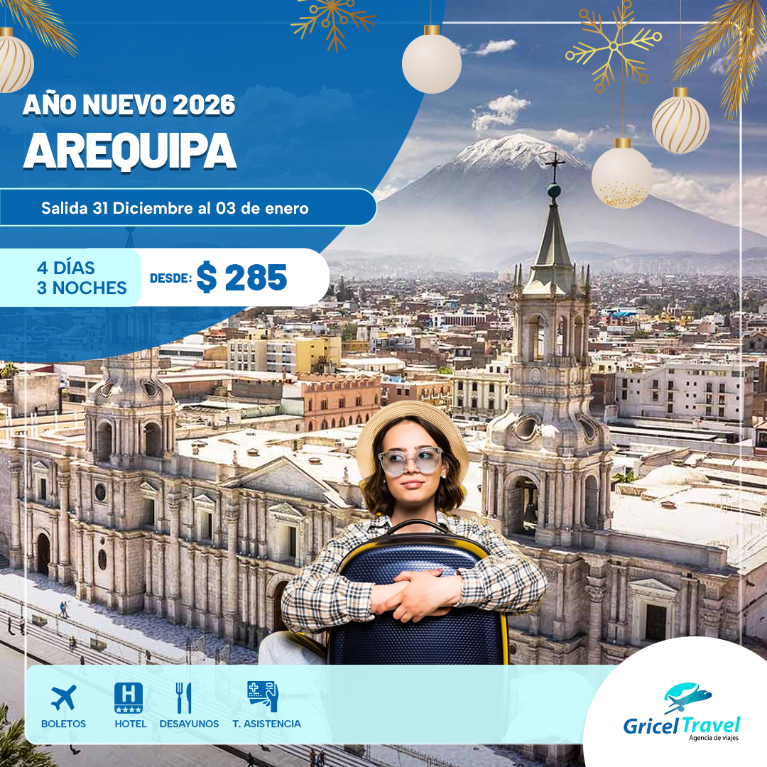 Con nuestros Paquetes Turísticos a Arequipa, podrás visitar el majestuoso Monasterio de Santa Catalina, explorar el impresionante Cañón del Colca, uno de los más profundos del mundo, y maravillarte con las vistas del imponente volcán Misti. Vive la tradición y la gastronomía arequipeña, famosa por su variedad y sabor, en un entorno de belleza natural incomparable. Con GRICEL TRAVEL, cada detalle de tu viaje a Arequipa está cuidadosamente planificado para que disfrutes de una experiencia única.